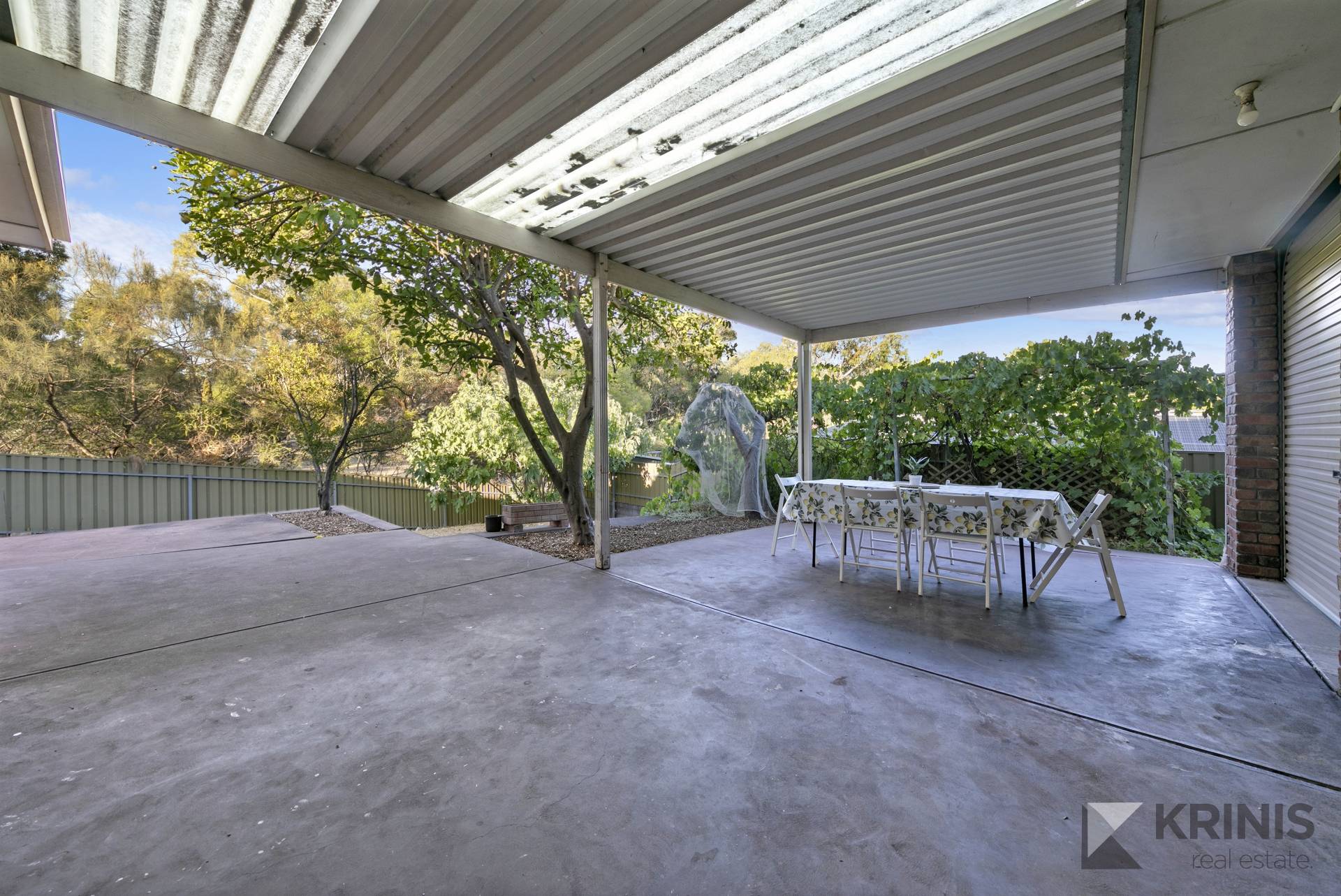 The rear yard offers a verandah, a large shed for extra storage and fruit trees.